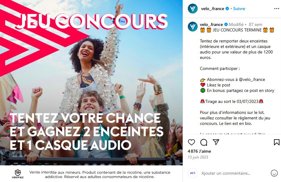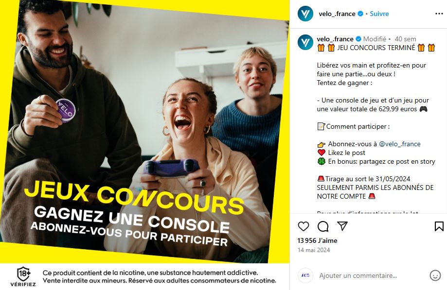 Avec des visuels colorés et un ton accrocheur, les cigarettiers organisent des jeux-concours proposant des lots attractifs (consoles, enceintes, casques audio). L’ACT a recensé 214 publications, majoritairement depuis 2023, avec les hashtags #etçapicote et #VELOToujoursAvecVous, liés à British American Tobacco, atteignant 114 840 personnes.